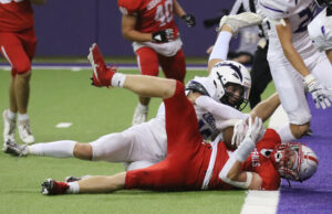 Cedar Falls’ defensive back Johnathan Beckman scored the first touchdown of the night by jumping a Xavier screen pass thrown by Andy Didio and returning it 32 yards to the house; Jacob Fagersten then came in to hit the extra point to give Cedar Falls a 7-0 lead. Fagersten was 4-for-4 on the night on point after touchdowns.